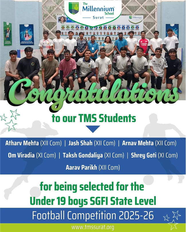 Proud Moment for TMS! Our talented football stars have made us proud by earning their place in the Under-19 Boys SGFI State Level Football Competition 2025-26! Congratulations to:Atharv Mehta (XII Com) | Jash Shah (XII Com) | Arnav Mehta (XII Com)Om Viradia (XI Com) | Taksh Gondaliya (XI Com) | Shrey Goti (XI Com)Aarav Parikh (XII Com)Your hard work, passion, and teamwork have brought this achievement home!