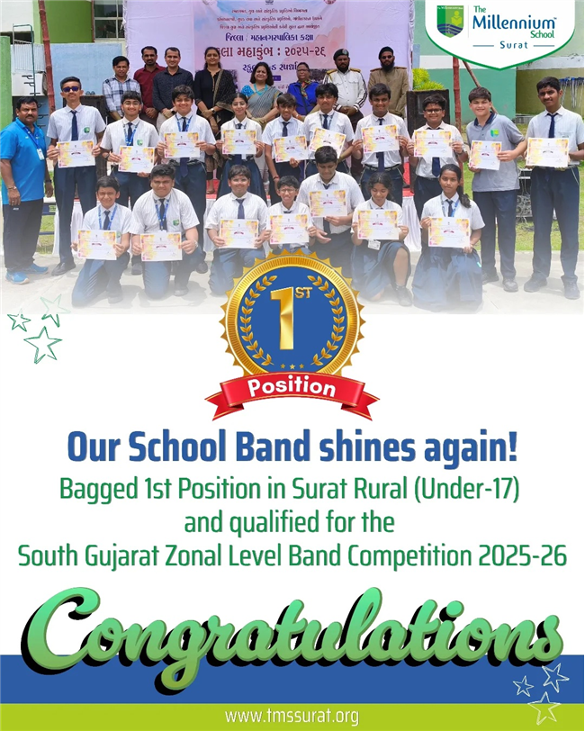 Proud Moment! Our School Band has once again proven their talent by bagging 1st Position in Surat Rural (Under-17) and qualifying for the South Gujarat Zonal Level Band Competition 2025-26! A huge congratulations to our young achievers for their dedication, rhythm, and teamwork.We wish them all the best for the upcoming zonal level!