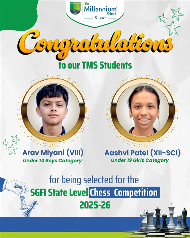 Every great move begins with a single step. Hearty congratulations to Arav Miyani (VIII) & Aashvi Patel (XII-SCI) for their outstanding achievement of qualifying for the SGFI State Level Chess Competition 2025-26!