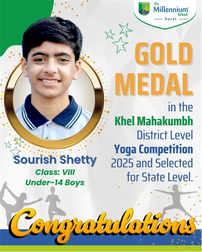 Congratulations to Sourish Shetty (Class VIII) for winning the Gold Medal in the Khel Mahakumbh District Level Yoga Competition 2025 and being selected for the State Level!
